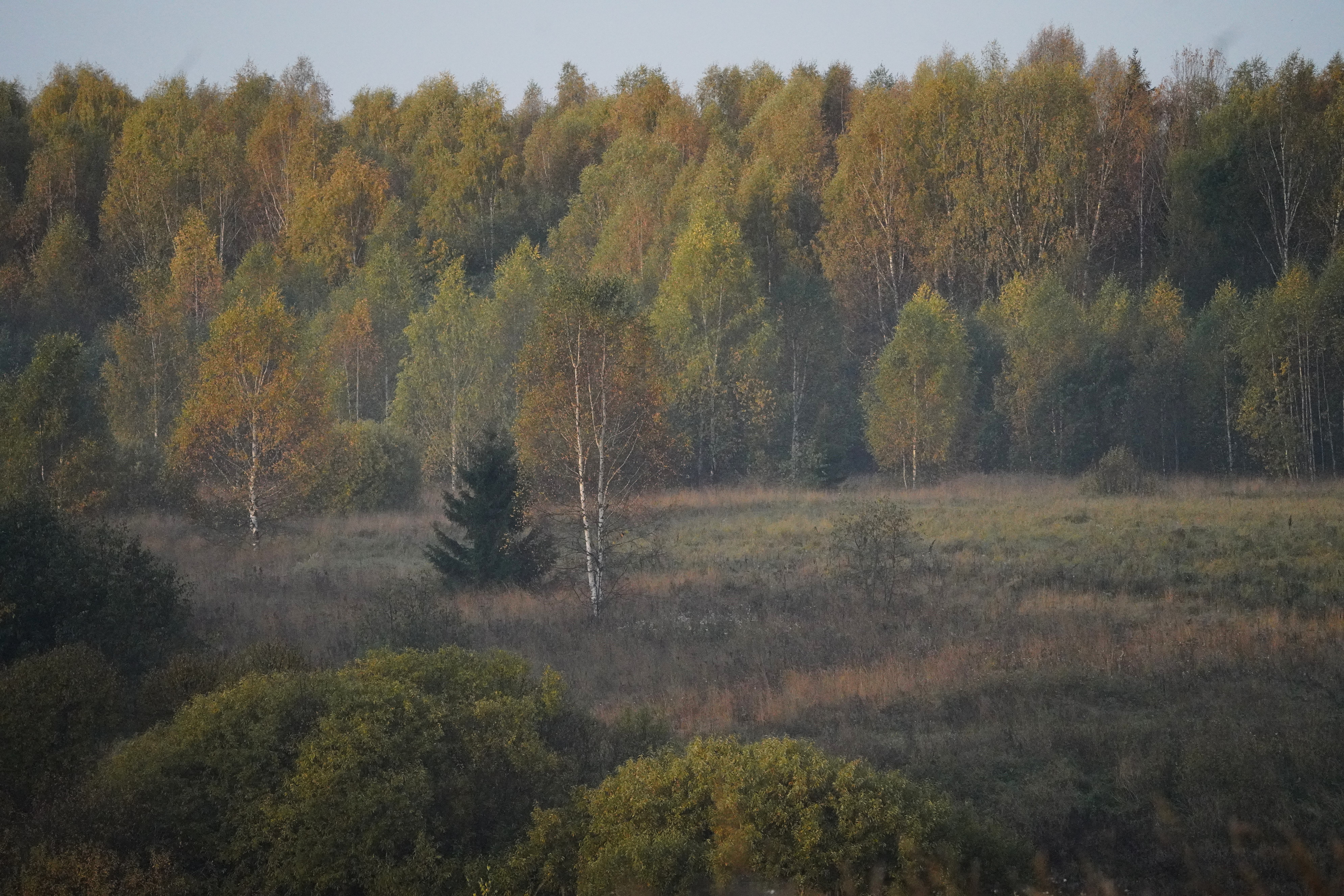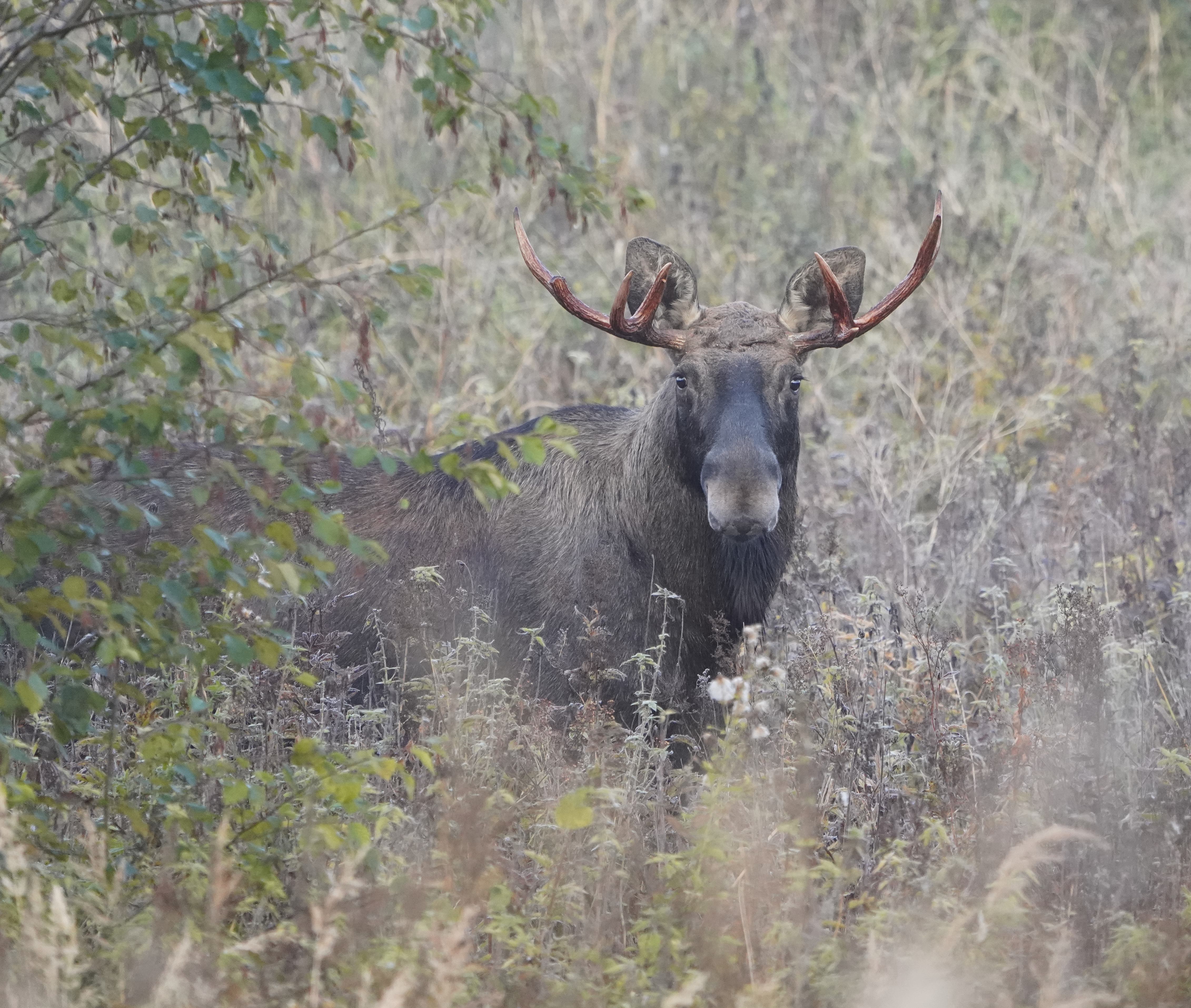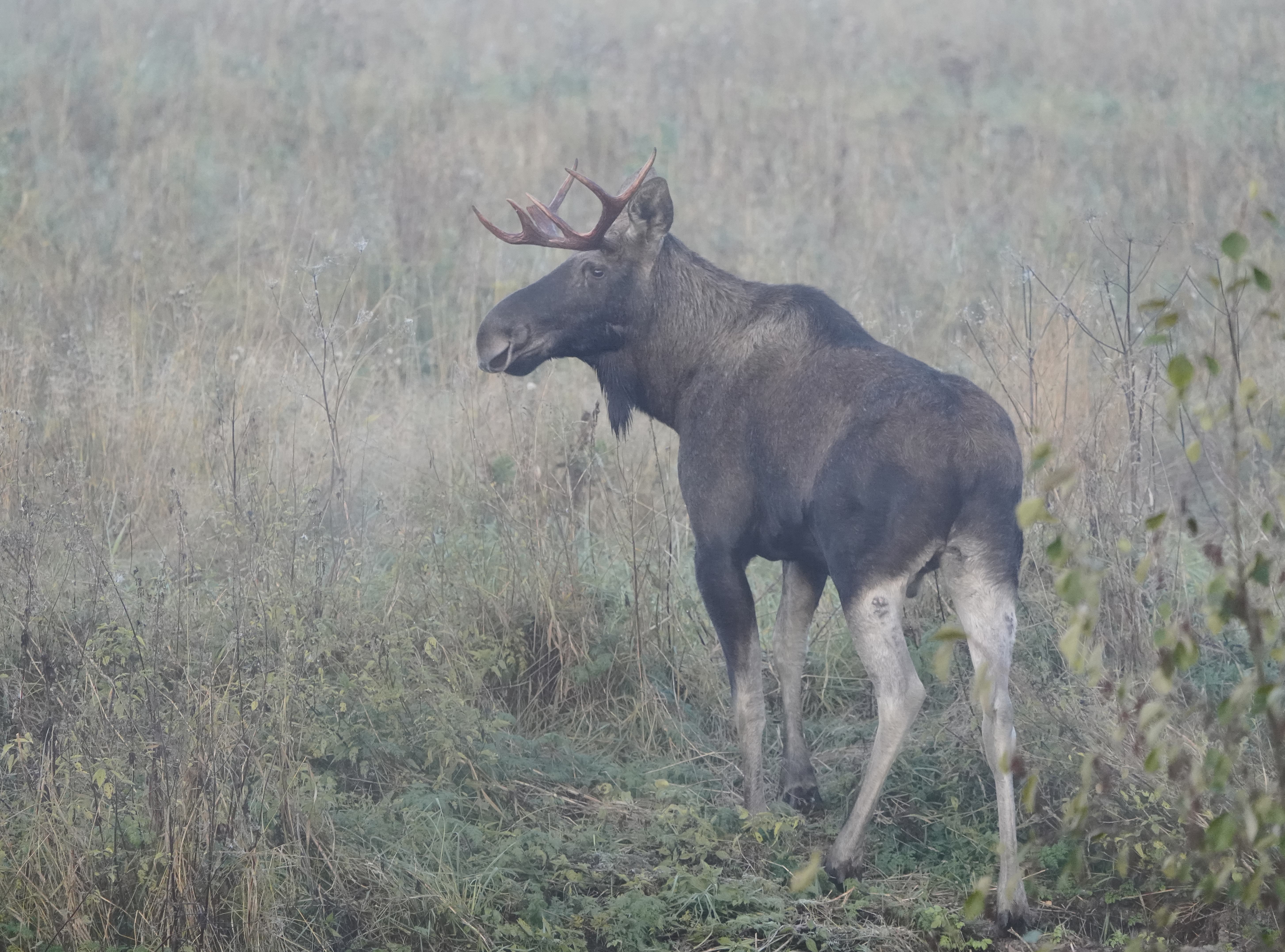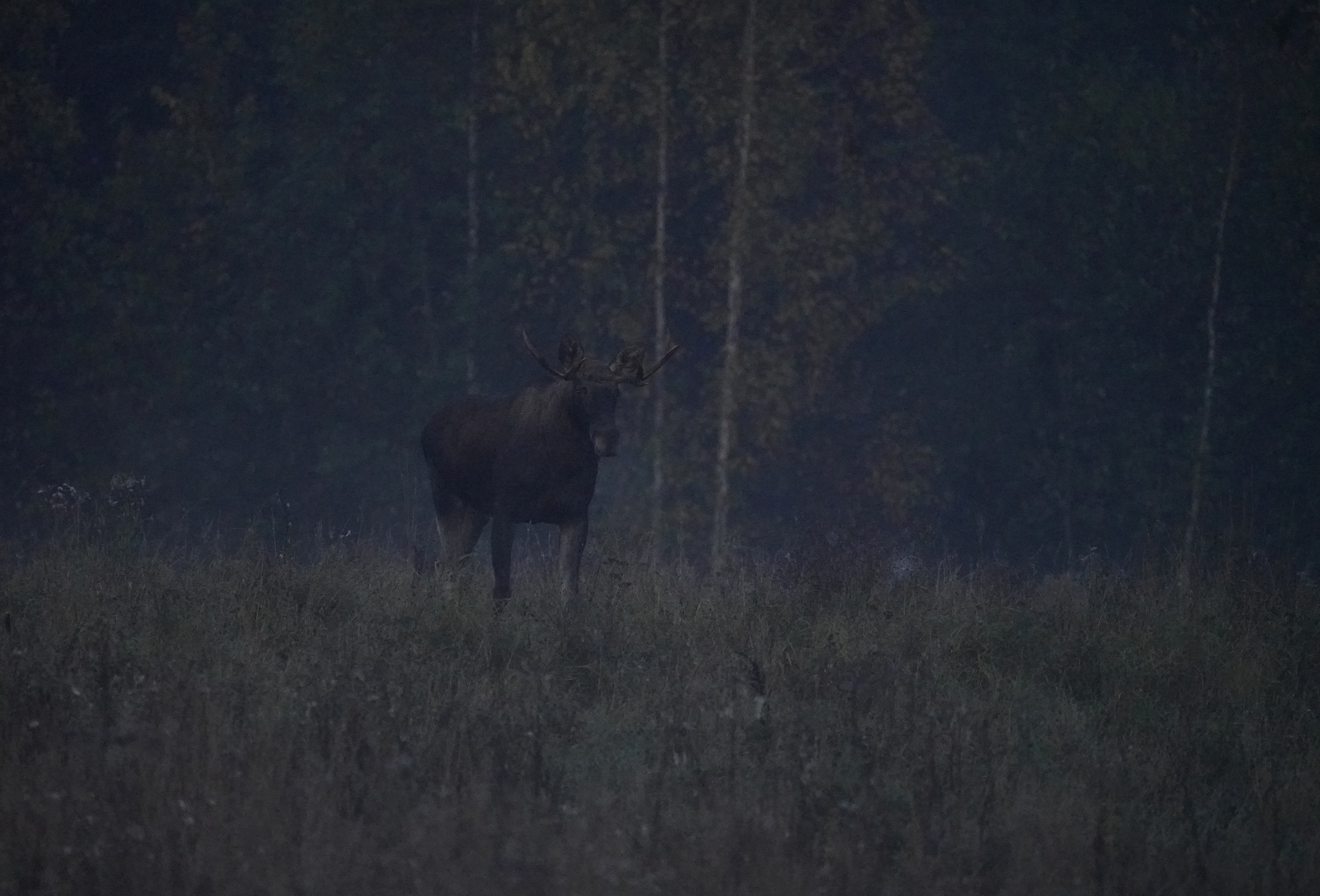 Спустя неделю встреча с лосем во время гона всё же состоялась. Процесс фотографирования был долгий и начался еще затемно. Первый заход был неудачным - мы разошлись встречными курсами, причем лось почуял мой запах и "залаяв" ушел в лес. Я его увидел на входе в лес, но снять не смог. Но терпение преодолело всё. Я понял, что зря пытался увидеть его в мелколесье и перешел на другую сторону и вышел на большую поляну по другую сторонуречки и стал ждать. И вот раздались уже знакомые "охи" или "кваканье", кому как нравится, и бык в туманной дымке нарисовался на поляне по другую сторону русла Дубца. Долго он на меня смотрел пока я на наживал параметры камеры, но потом решил, что вот его счастье и он видит лосиху и двинулся ко мне, плотоядно облизываясь и охая по дороге. Я понял что у меня уже не одна задача- снять лося на гону, но и другая не менее важная- не быть жестоко изнасилованным вместо отсутствующей лосихи. Несмотря на все трудности обе задачи (особенно вторая) удались!