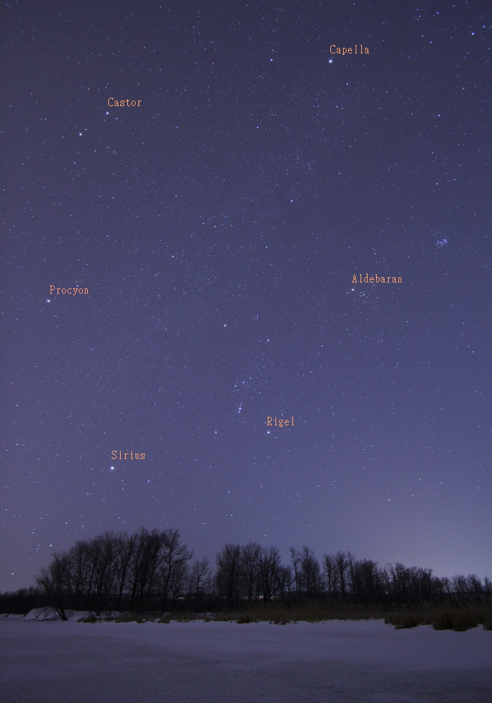 Зимний шестиугольник - астеризм из ярких звезд, которые в наших широтах лучше всего видны в зимний период. Эта фигура образована звездами Сириус (альфа Большого Пса), Ригель (бета Ориона), Альдебаран (альфа Тельца), Капелла (альфа Возничего), Кастор (альфа Близнецов), и Процион (альфа Малого Пса).