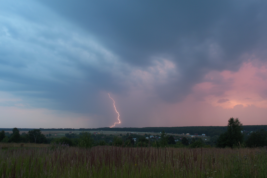 Обычно закат предвещает покой и сон, но не в тот раз. Пришедшая вечером 16 июля 2016 года гроза была первой, но не последней в прокатившемся по Нижегородской области холодном фронте. В дер. Килелей, где было сделано фото, прогремели две грозы (вторая пришла после часа ночи 17 июля), а вообще признаки грозовой активности продолжались почти до рассвета.